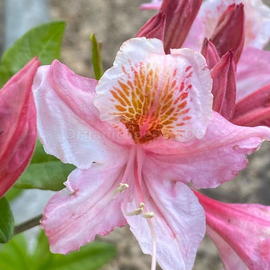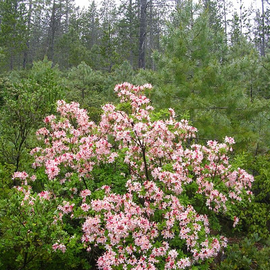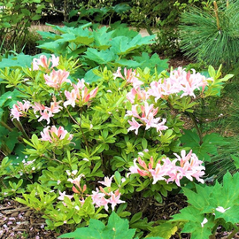 An evergreen, fast-growing rhododendron with delicate pink-white flowers and a diameter of up to 9 cm, it is used in landscape design to create a variety of landscape compositions, flower beds, and alpine slides.