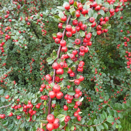 A deciduous shrub, the plant acquires a special beauty with the appearance of bright red fruits, which can remain on the bushes until late winter. Cotoneaster is beautiful in the fall, when the leaves turn various shades of orange and red.
