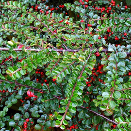 An ornamental deciduous shrub from the Rosaceae family, prized for its resilience and vibrant fruit, it lends itself well to shaping, making it often used in hedges and decorative arrangements.
