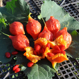 A perennial herbaceous vine, when ripe the fruit splits into three valves that open like petals, revealing grains covered in a sticky, sweet, dark-ruby pericarp. At this time the vine is unusually beautiful and exotic.